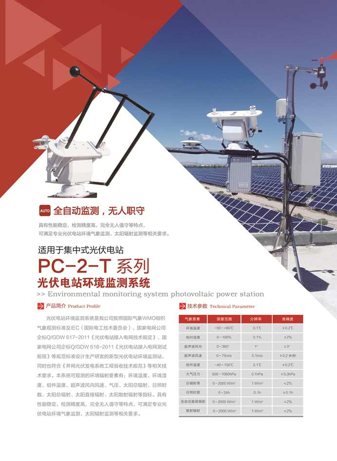 PC-2-T2型光伏电站环境监测系统,该系统具有性能稳定,检测精度高,完全无人值守等特点,可完全满足调度对光伏电站气象数据和太阳辐射数据的考核要求。