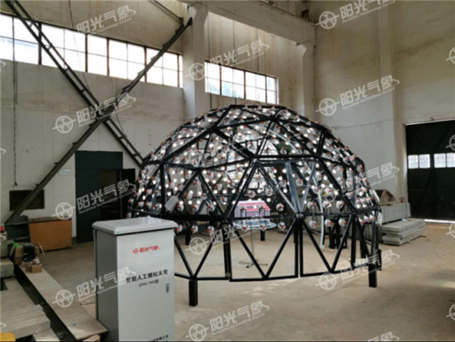JZYG-TGS型智能人工模拟天穹主要功能有:1、模拟CIE全云天天空,可用于建筑模型的采光实验,特别是采光系数的测试,对采光口的研究提供科学的实验数据。2、模拟太阳实时轨迹,通过计算机软件控制,实现太阳高度角及方位角的自动定位,从而实现了太阳实时模拟。