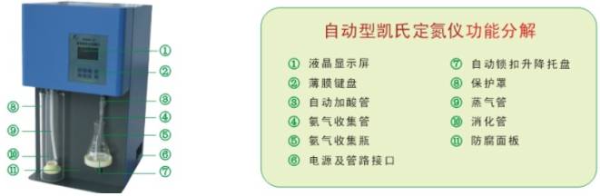 JZYG-ZDDN型全自动凯氏定氮仪(也称为蛋白质测定仪)是本公司按凯氏定氮法为原理设计出来的一款产品,主要用来检测粮食、食品、乳制品、饮料、饲料、土壤、水、药物、沉淀物和化学品等中的氨氮、蛋白质氮等含量,检测方法符合国标、AOAC、ISO等。