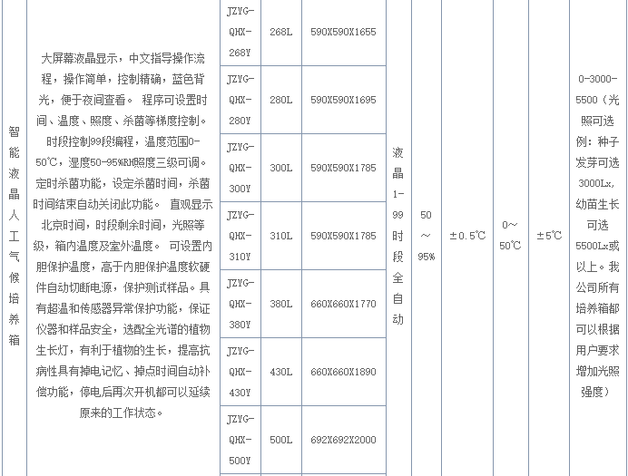 智能人工气候培养箱(种子发芽箱,智能人工气候培养箱)每种型号后面的B代表昼夜两个温度、时间段;D代表1-30个温度、时间、光照段,自由组合实验周期显示,光照级别显示。例:JZYG-QHX-268B为昼夜2个时间段;JZYG-QHX-268D为1-8个多时间段多段设置其中:温度、湿度、光照、时间均可多段设置。