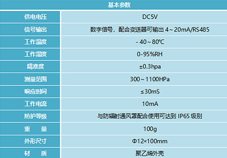 QA-1型气压传感器是专业测量大气压力的传感器。内部选用高精度的元件,并设有防浪涌和极性反相?;?。外形美观、小巧,安装方便,节省空间。气压传感器要求安放在专用防辐射通风罩内,工作环境相对稳定,且与外界大气通道畅通,此传感器可与多种数据采集器或变送器配合使用,精准测量大气压力数据,广泛于气象、环保、农业、光伏、电力、交通等行业。