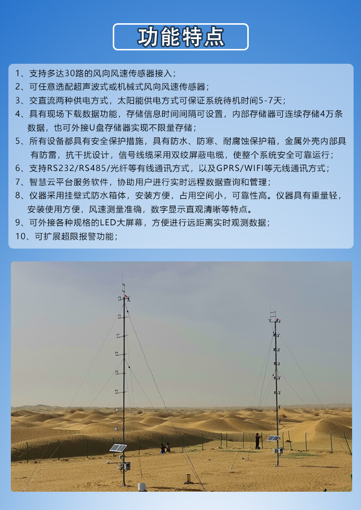 由于受到地表摩擦的作用,接近地表的风速随着离地面距离的减小而降低,造成同一位置不同高度的风速风向存在差异,这样就会对一些行业运行产生影响。我公司生产的PC-2F型多通道风向风速监测站是由新一代的多通道风速风向监测记录仪与风向风速传感器组成的,用于观测记录同一位置不同高度的风向风速瞬时值及平均值的专业设备,具有测量精度高、人机界面友好、人工干预少、交直流供电等特点。