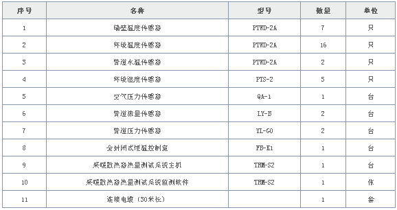 产品组成:墙壁温度传感器、环境温度传感器、管道水温传感器、环境湿度传感器、空气压力传感器、管道流量传感器、管道压力传感器、全封闭式恒温控制室、采暖散热器热量测试系统主机、采暖散热器热量测试系统监测软件、连接电缆等。