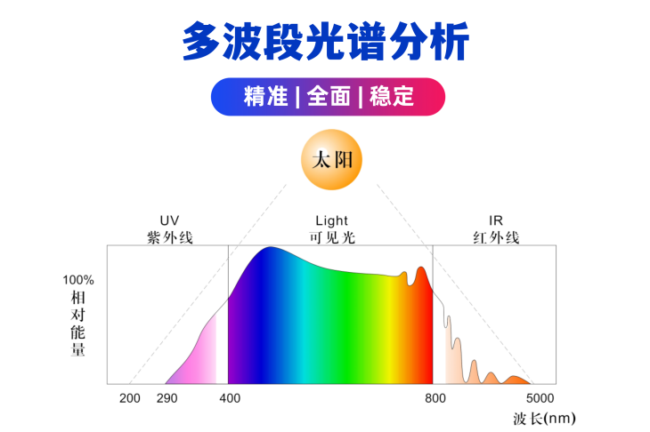 5、选配不同波段的分光谱辐射表可实现太阳辐射中的总辐射、绿光、近红外、紫外、红橙光、红外、紫蓝光、可见光、远红外的实时监测分析,还可以集成其他类型的太阳辐射表;