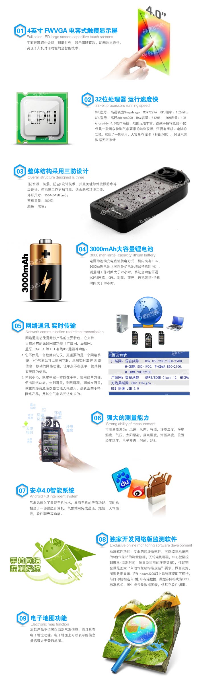 手持气象站是我公司研发的新二代便携式自动气象站。主要用于便携条件下实施气象观测。它具有测量精度高、稳定可靠、体积小、重量轻、携带方便、可直接手持观测等突出优点。系统能自动测量环境温度、湿度、露点、风速、风向、辐射、海拔和当前经纬度等气象要素。手持气象站可自动储存历史数据,内置大容量存储卡,可连续存储50年数据,并通过电容式触摸屏直接读取实时气象数据、历史数据、历史曲线。同时手持气象站可使用网络通讯功能,将实时采集到的气象数据信息同步发送到网络数据中心。