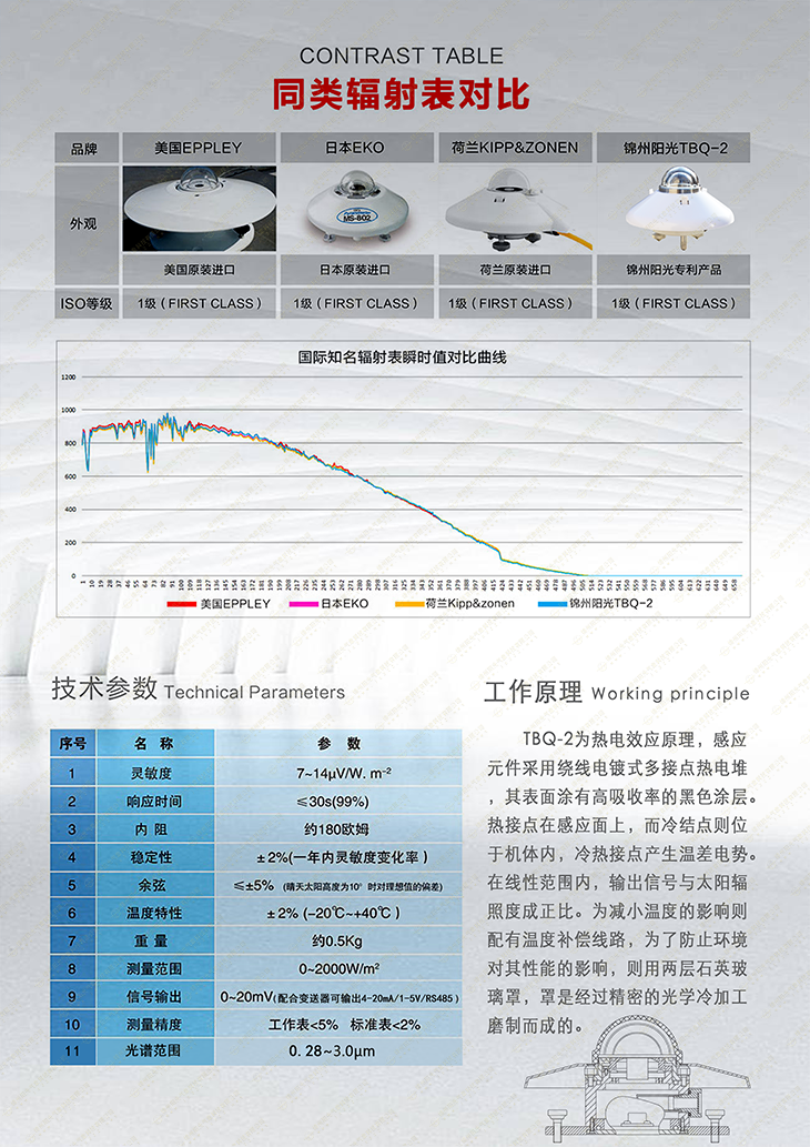 我公司生产的TBQ-2太阳总辐射表是根据热电效应原理,用来测量光谱范围为0.28-3.0μm太阳总辐射(亦可用来测量入射到斜面上的太阳总辐射)的感应元件。它有耐腐蚀能力强,精度高等特点。