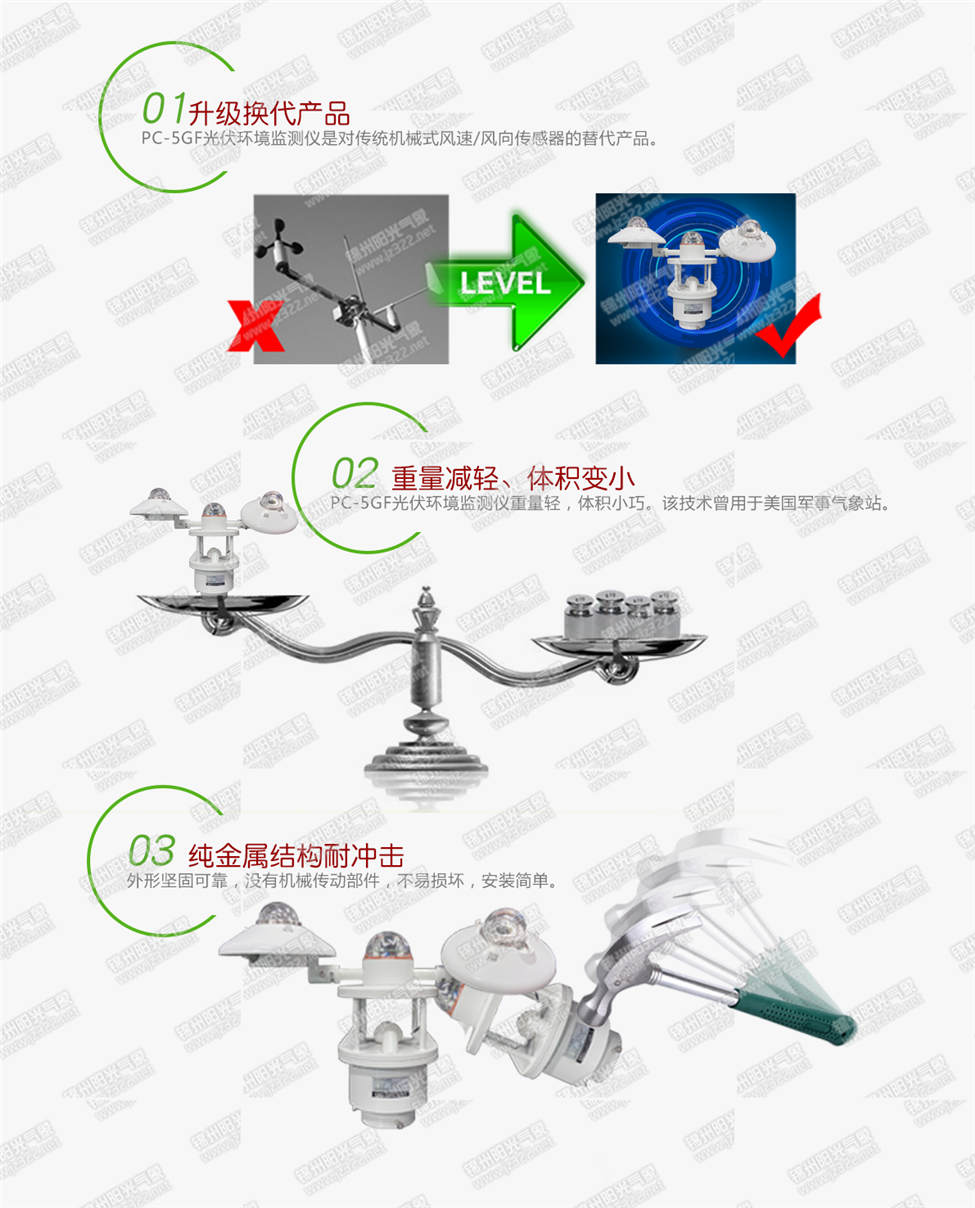 本产品除了可同时监测环境温度、环境湿度、风速、风向、气压、雨量五大环境基本要素外,还可以监测光伏电站环境系统中所必须的太阳辐射(水平/斜面)及组件温度等要素。特别采用了高稳定性的太阳总辐射传感器,具有完美的余弦特性、快速响应、零漂移和宽温度响应的特性,非常适合太阳能行业的辐射监测使用,两台角度可以任意旋转的总辐射表可满足光伏行业光功率预算需求,是目前最适合光伏电站上使用的领先级的一体化便携光伏环境监测仪。