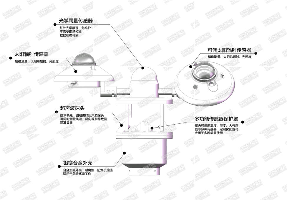 3. 采用先进的监测技术,风速风向的监测采用了超声波技术,不但测量精度高,性能稳定,而且无需维护;雨量的监测采用了光学的原理,体积小巧、免维护,更适于用在无人值守的现场。