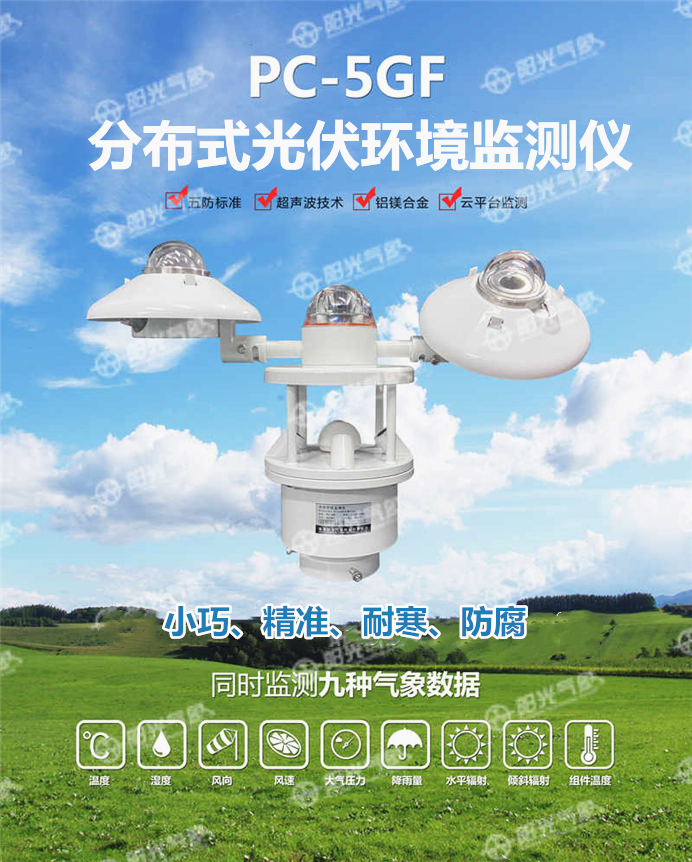 PC-5GF分布式光伏环境监测仪是锦州阳光气象科技有限公司自主研发的一款便于安装、测量精度高、性能稳定,并集成多项气象要素为一体的具有金属防爆外壳的环境监测仪。本产品根据太阳能资源评估、太阳能系统监测需要,并结合国内外太阳能观测系统的先进技术研制而成的。