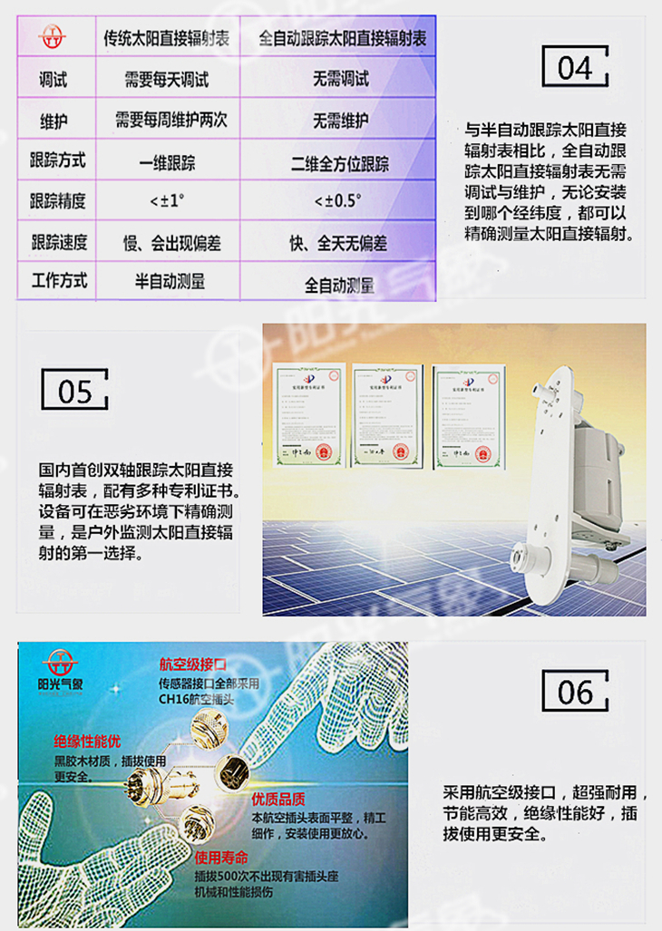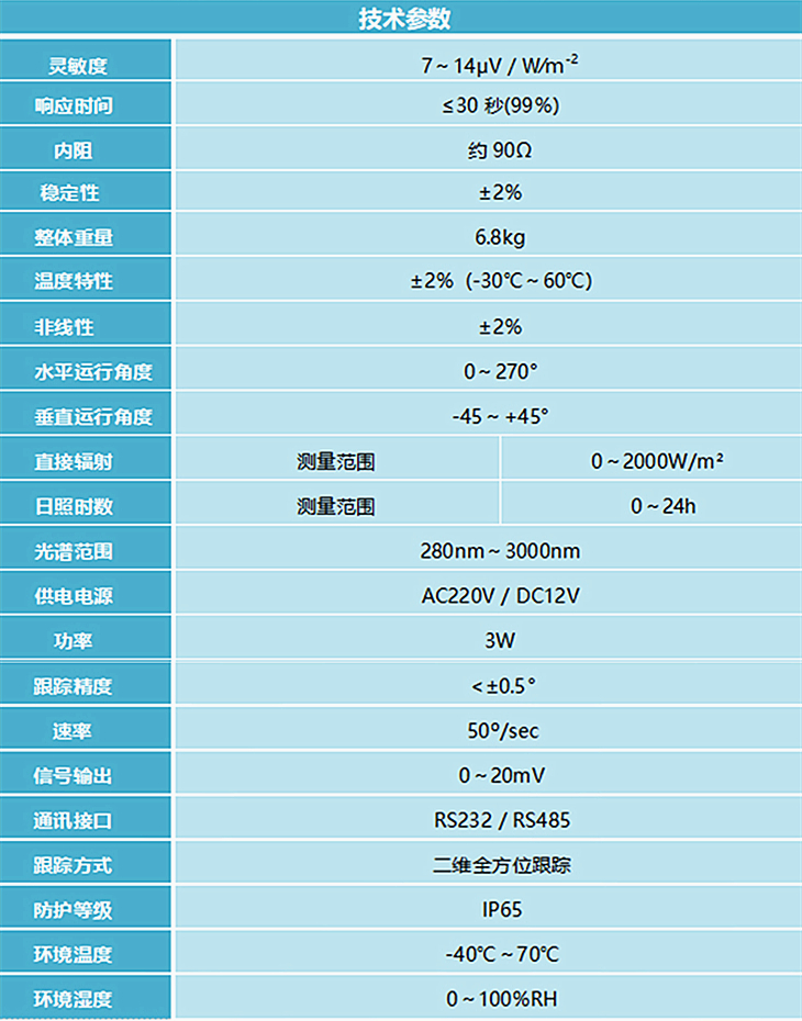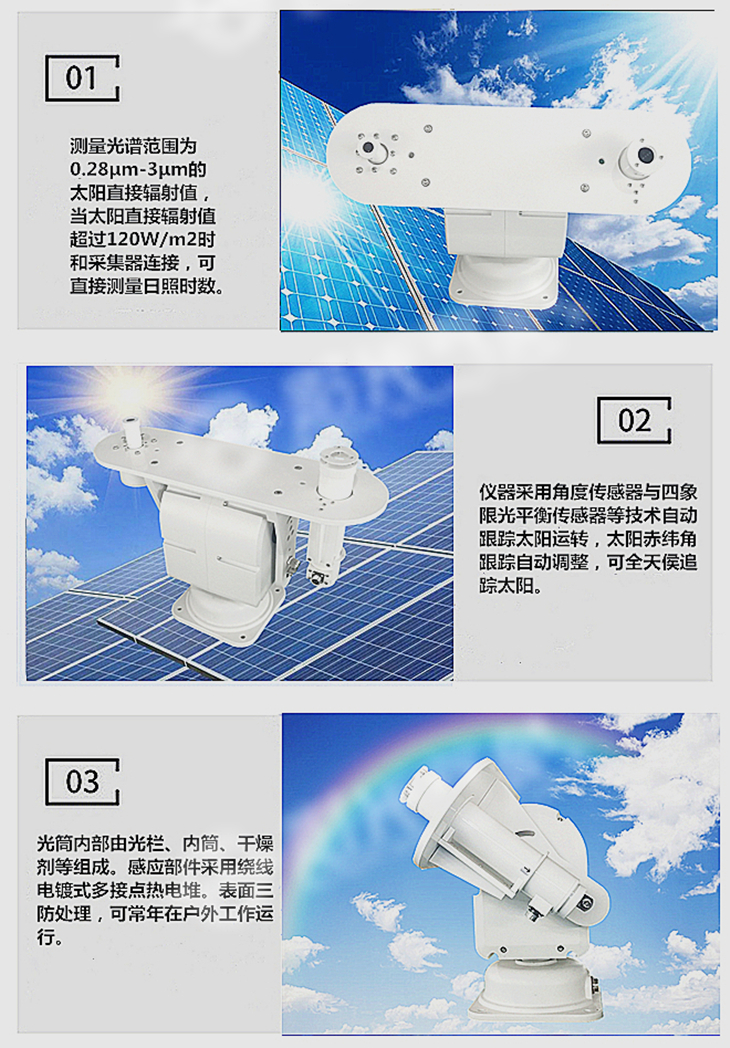 TBS-3全自动跟踪太阳直接辐射表是国内的无人值守太阳直接辐射表。它人性化的设计理念,使人们对太阳直接辐射的测量不再繁琐。无需每天的调试,无需不停的维护,你只需要将它安装在测试场地,就可以精确的测量到每天不同时刻的太阳直接辐射值。