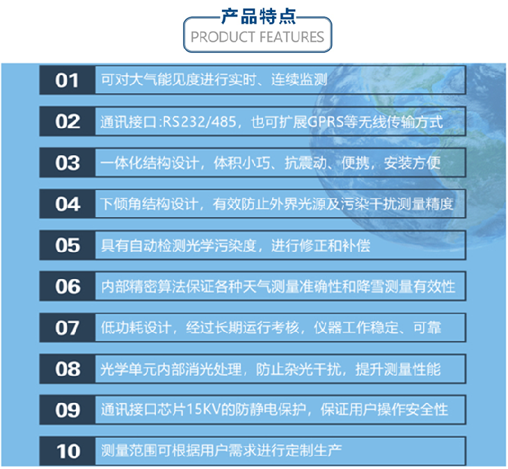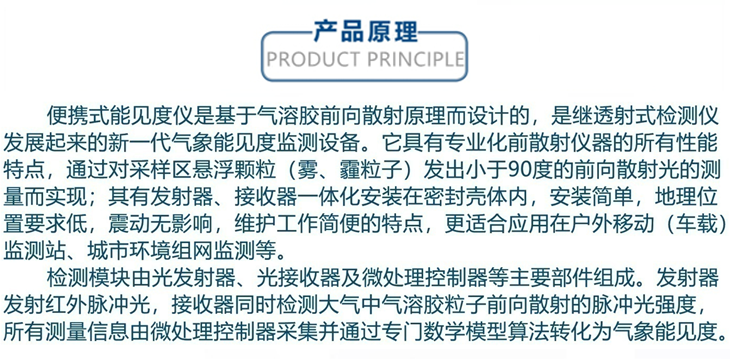 便携式能见度仪是基于气溶胶前向散射原理而设计的,是继透射式检测仪发展起来的新一代气象能见度监测设备。它具有专业化前向散射仪器的所有性能特点,通过对采样区悬浮颗粒发出小于90度的前向散射光的测量而实现;设备发射器、接收器一体化安装在密封壳体内,安装简单,地理位置要求低,振动无影响。