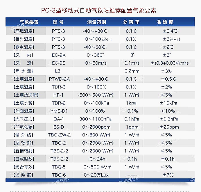 自动气象站是一种能自动地观测和存储气象观测数据的设备,PC-3型移动式自动气象站采用一体化设计,它具有移动观测能力,测量精度高,集成多项气象要素的可移动观测系统,可测量风向、风速、温度、湿度、气压、雨量、光照度、土壤温度、土壤湿度、露点、太阳辐射量、太阳紫外线等多项信息并做公告和趋势分析便于用户对气象数据的使用、分析和处理。该气象站是测量气象要素非常全面的小气候观测站,可根据用户需要灵活增加或减少相应的??楹痛衅鳎陕愀骼嘤没У男枨?。