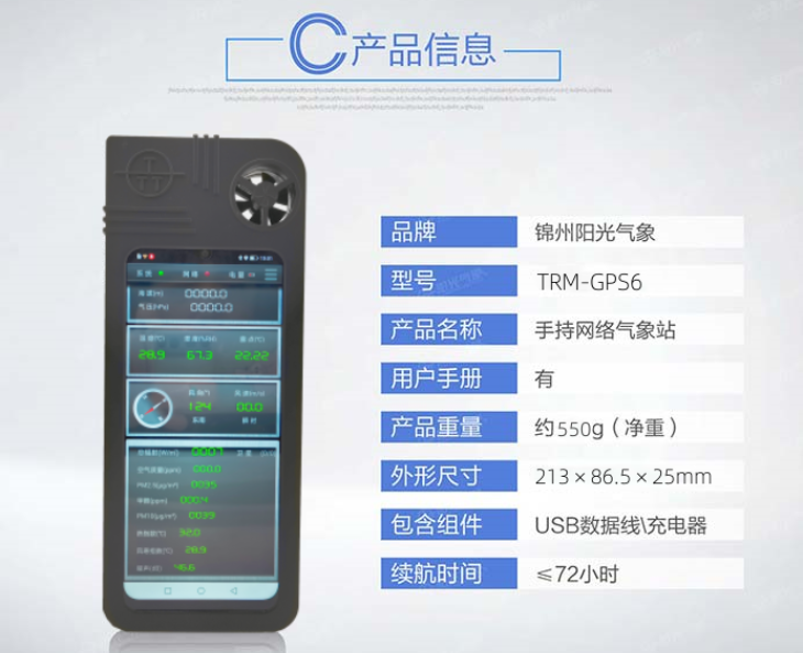 TRM-GPS6型手持气象站是我公司研发的第四代便携式自动气象站。主要用于便携条件下实施气象观测。它具有测量精度高、稳定可靠、体积小、重量轻、携带方便、可直接手持观测等突出优点。系统能自动测量环境温度、湿度、露点、风速、风向、辐射、空气质量、PM2.5、PM10、甲醛、大气压力、海拔、热指数、风寒指数、噪声和当前经纬度等气象要素。手持气象站可自动储存历史数据,内置大容量存储卡,可连续存储50年数据,并通过触摸屏直接读取,实时将数据共享到网络云数据中心(阳光智慧云)。