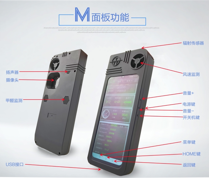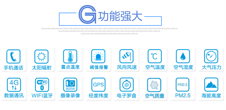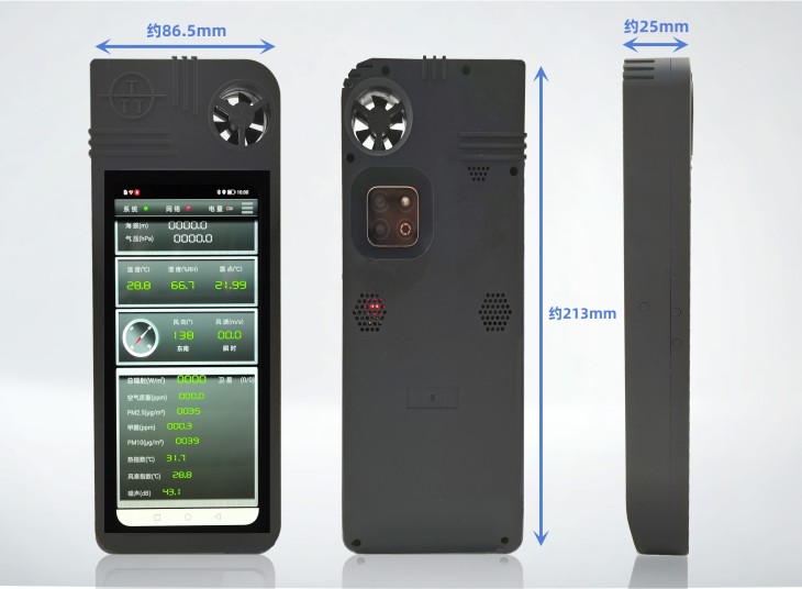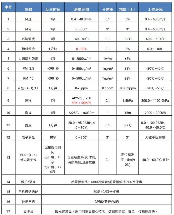 测量要素为:风速,风向,环境温度,环境湿度,气压,太阳辐射,风寒指数,热指数,露点,海拔高度,位置经度纬度,电子罗盘,时间,空气质量、PM2.5、PM10、甲醛、照拍/录像 , 手机通话功能 , GPRS无线数据网络,数据云平台。