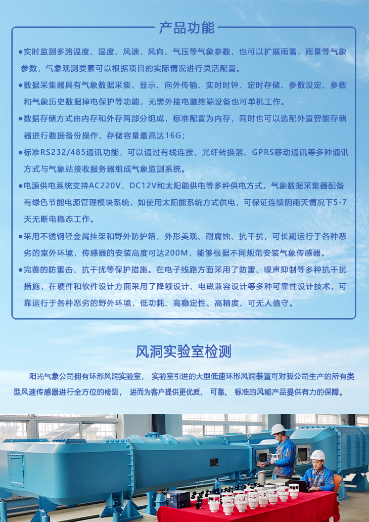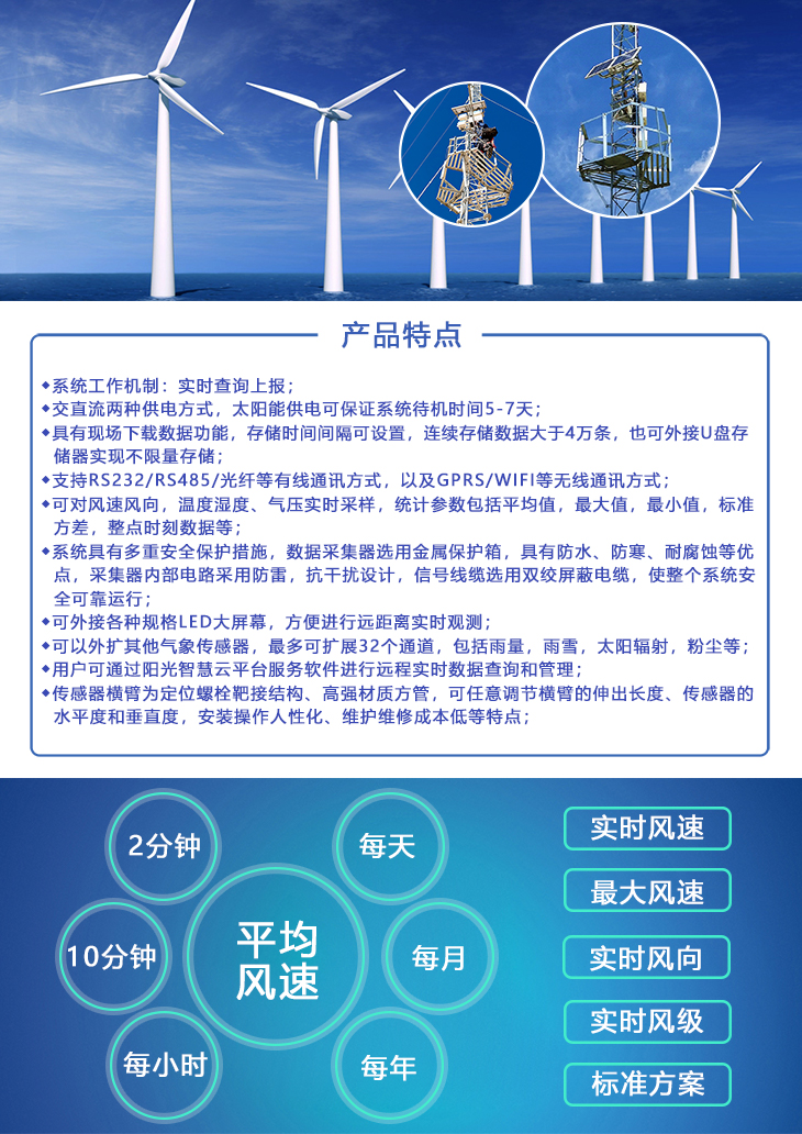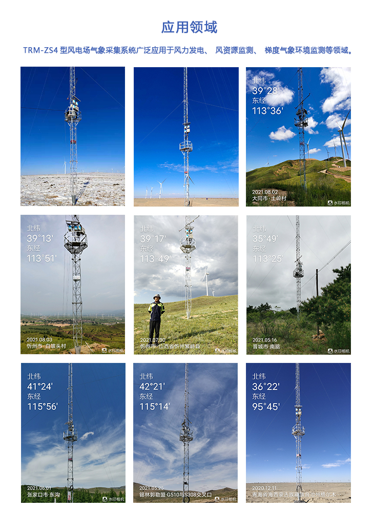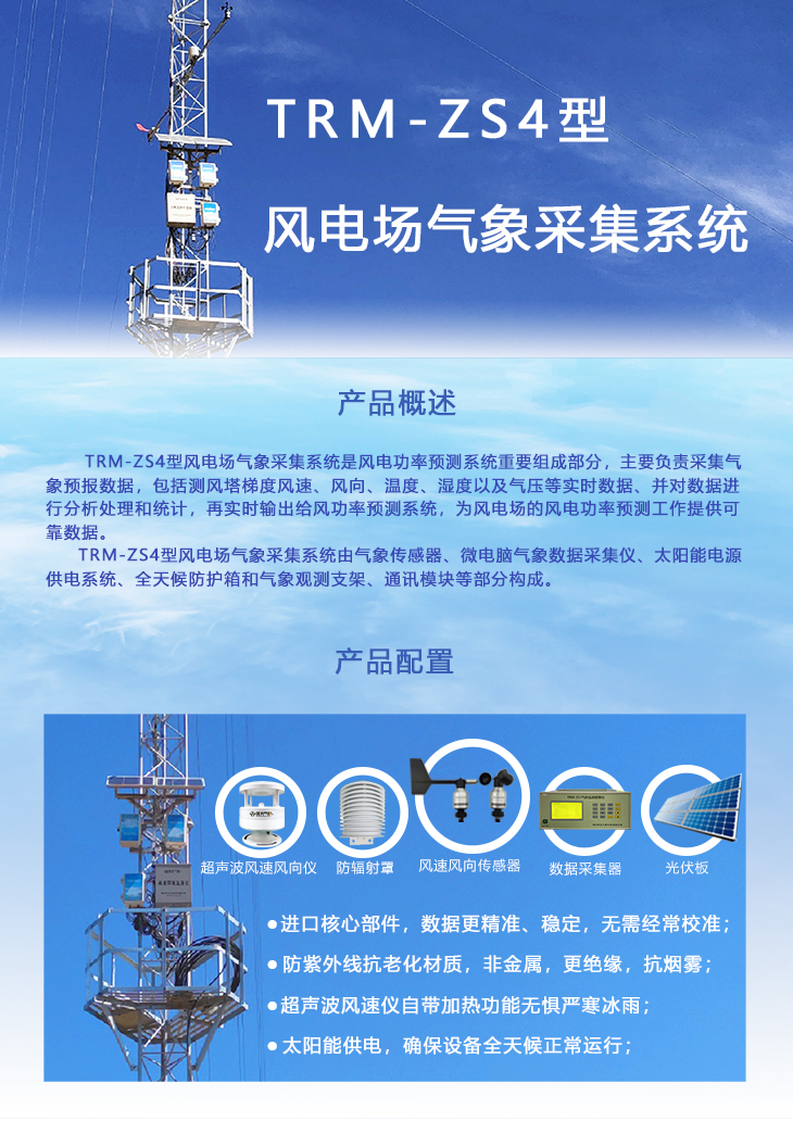 TRM-ZS4型风电场气象采集系统是风电功率预测系统重要组成部分,主要负责采集气象预报数据,包括测风塔梯度风速、风向、温度、湿度以及气压等实时数据、并对数据进行分析处理和统计,再实时输出给风功率预测系统,为风电场的风电功率预测工作提供可靠数据。TRM-ZS4型风电场气象采集系统由气象传感器、微电脑气象数据采集仪、太阳能电源供电系统、全天候防护箱和气象观测支架、通讯??榈炔糠止钩?。
