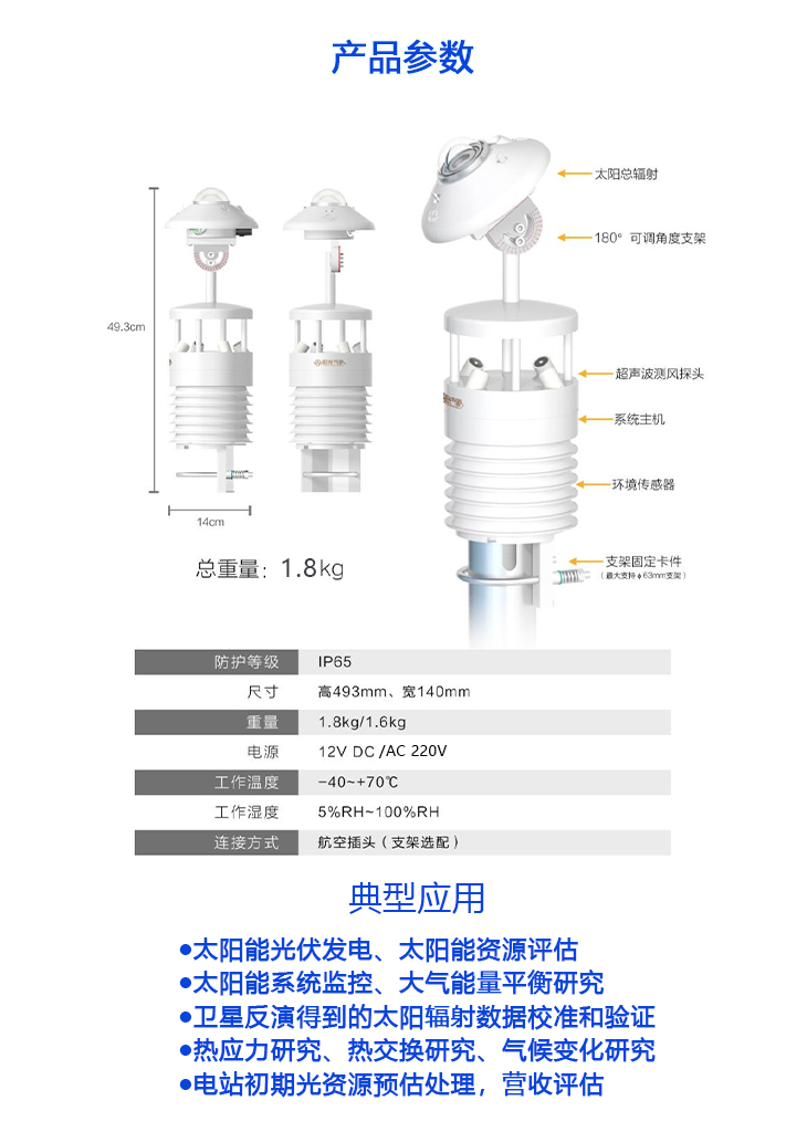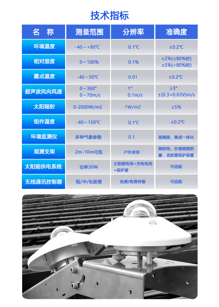 本产品是专业针对光伏发电站研发生产的一体化光伏环境监测仪,该设备采用新型一体化结构设计,测量精度高,安装使用方便,采用独特的一体化超声波微气象仪,集温湿度、风速、风向、压力、背板温度集成于一体。具有高精度,高稳定性,是目前非常适合光伏发电站上使用的一体化光伏环境监测仪。