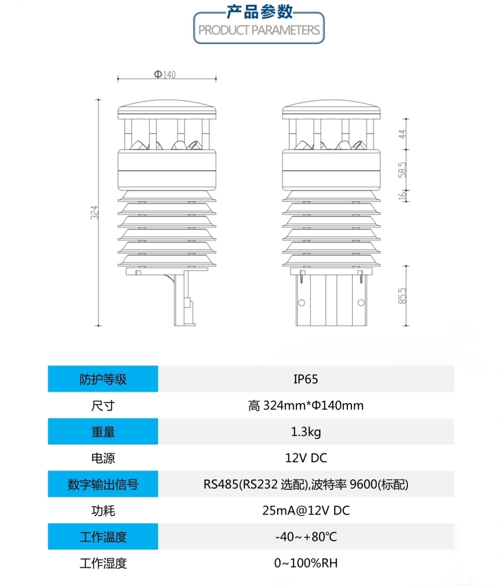 PC-8D型气象五参数环境监测仪是我公司自主研制的一种测量多要素气象要素的传感器,可同时测量大气温度、大气湿度、风速、风向、气压等五种主要气象要素。其特点是精度高,响应时间快,串口输出,方便用户直接通过PC或外接仪器进行测量。