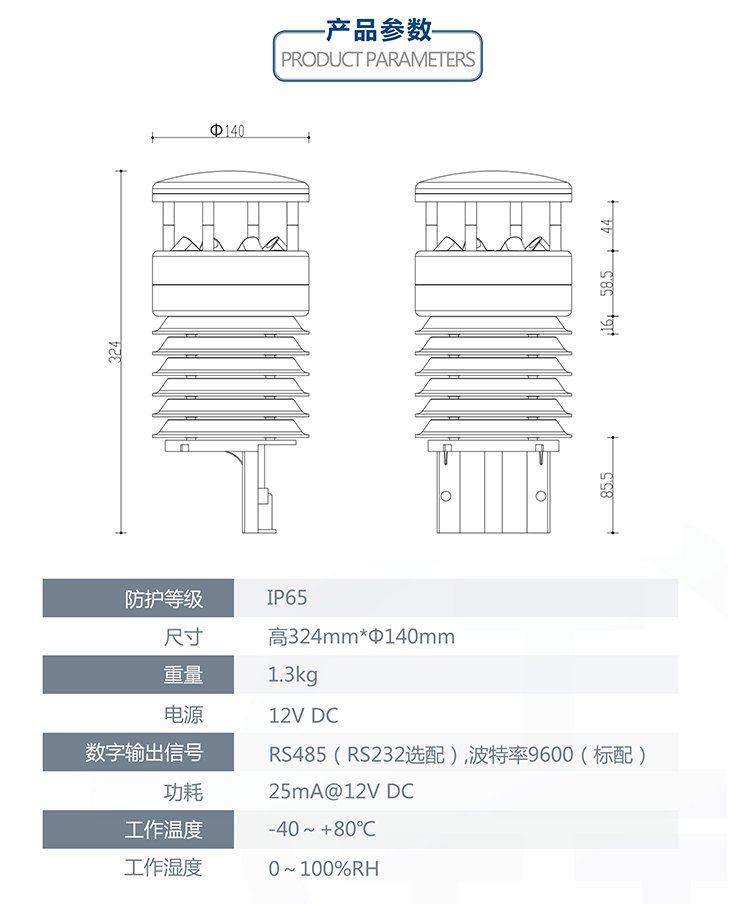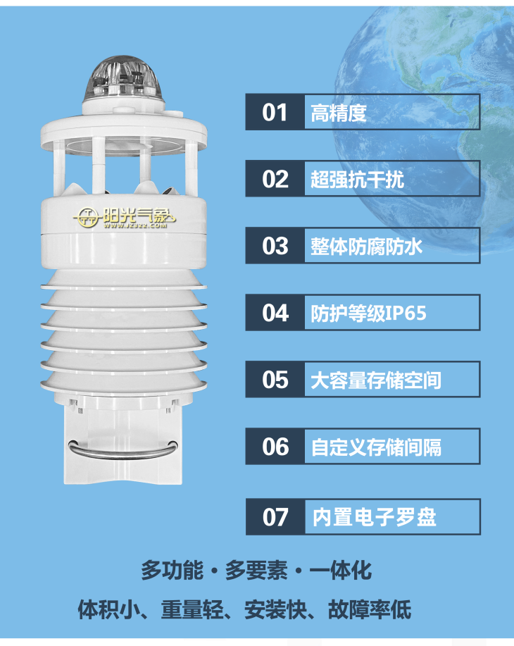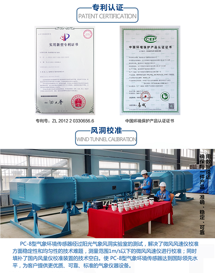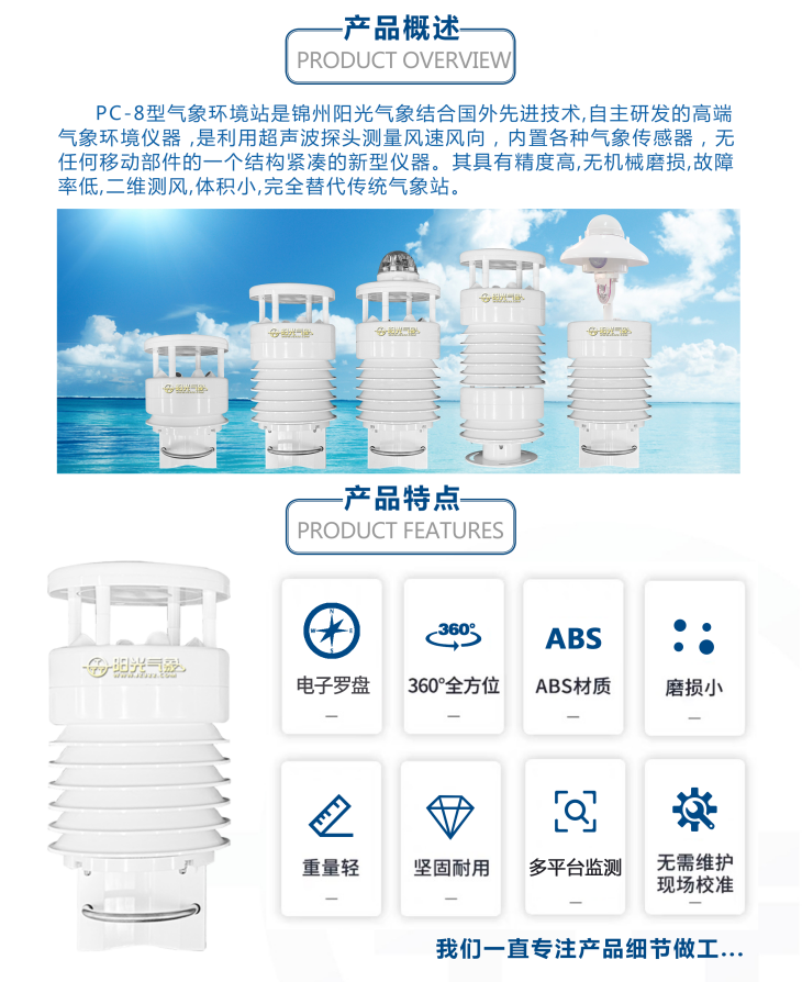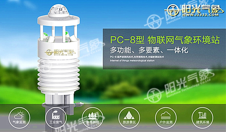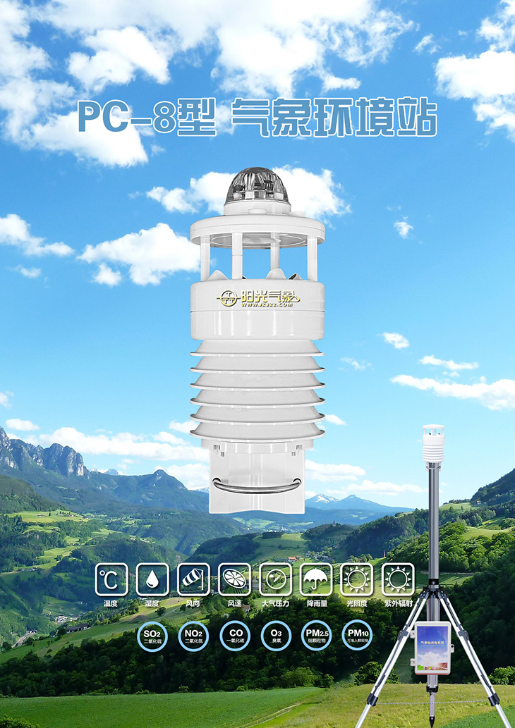 PC-8型气象环境站是锦州阳光气象结合国外先进技术,自主研发的高端气象环境仪器,是利用超声波探头测量风速风向,内置各种气象传感器,无任何移动部件的一个结构紧凑的新型仪器。其具有精度高,无机械磨损,故障率低,二维测风,体积小,完全替代传统气象站。