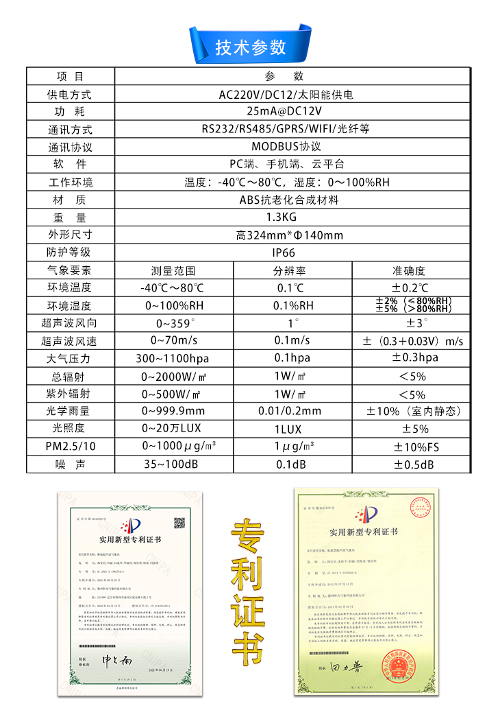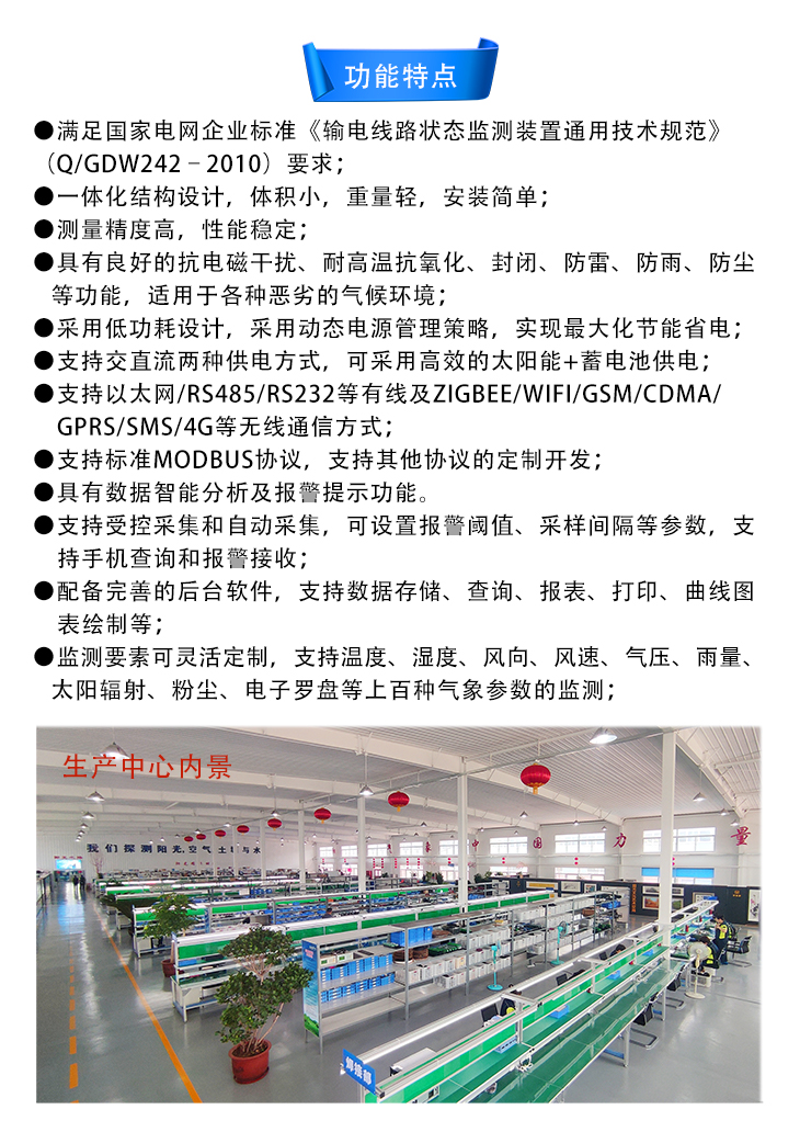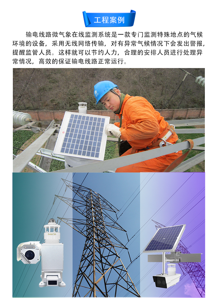 高压输电线路微气象在线监测系统是为满足输电线路局部气象环境监测需要而自主研发的、拥有全部知识产权的多要素微气象监测预警系统,输电线路微气象在线监测系统集数据采集、存储、传输和管理于一体,可实时采集环境温度、湿度、风速、风向、气压、雨量、太阳辐射等气象参数,并通过RS485/WiFi/GPRS或4G网络将监测信息发送至远程监控中心,或传输给视频监控设备,实现二次集成。当出现异常情况时,系统会以多种方式发出预报警信息,提示管理人员对报警点予以重视或采取必要措施。