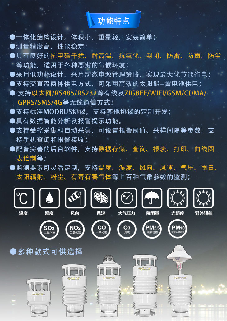 智慧路灯杆作为一个很好的载体,智慧灯杆配备的气象检测可以24小时实时在线连续采集监测环境及气象数据,包括PM2.5,温度、湿度、气压、风向、风速、风力、噪音等等,并可在信息屏上实时显示。系统提供的统计分析功能,还可分析出一段时间,如一个月、半年等维度的空气质量整体情况,输出统计报告等。