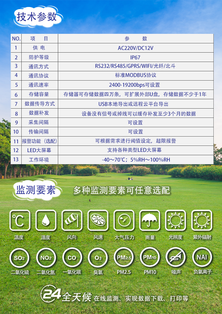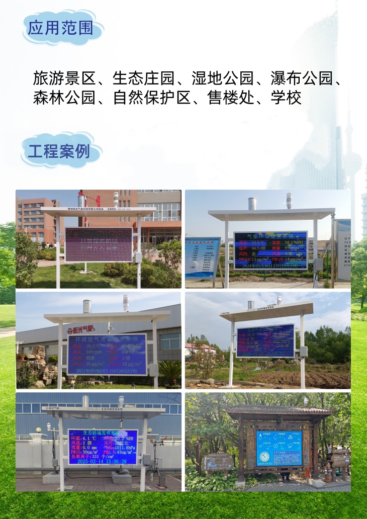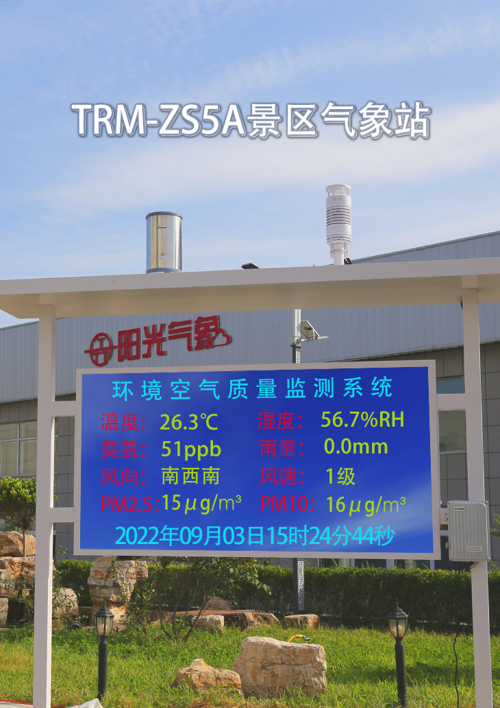 TRM-ZS5A型景区气象站,又称为景区气象监测站,是专门针对景区气象环境特点而研发和设计的一款自动化的气象设备,外形美观、安装简单,可以根据不同地区的气候特性选择不同的监测要素,支持多种传输方式,系统由一体化气象站和彩色LED大屏幕组成,系统可将采集的数据实时显示在大屏幕上,也可以通过GPRS/WIFI网络传输至云平台供客户下载查看。