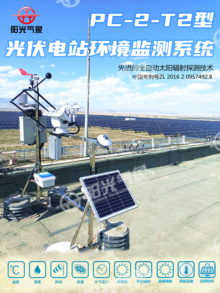 PC-2-T2型光伏电站环境监测系统是我公司按照气象WMO组织气象观测标准及IEC、国电网公司企标Q/GDW 617-2011《光伏电站接入电网技术规定》、国电网公司企标Q/GDW 618-2011《光伏电站接入电网测试规程》等规范标准设计生产研发的新型光伏电站环境监测站,同时也符合《并网光伏发电系统工程验收技术规范》等相关技术要求。本系统可观测的环境辐射要素有:环境温度、环境湿度、组件温度、风速、风向、气压、倾斜总辐射、日照时数、水平总辐射、太阳直接辐射、太阳散射辐射等指标。具有性能稳定,检测精度高,完全无人值守等特点,可满足光伏电站环境气象监测、太阳辐射监测等相关要求。