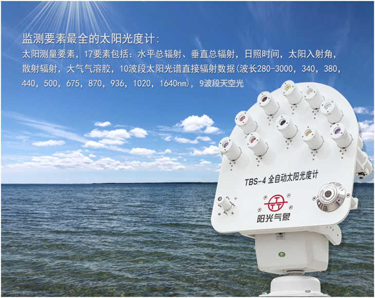 TBS-4全自动太阳光度计为高精度野外太阳和天空辐射测量仪器,不但可以测量十个波段的太阳直接辐射,还可以测量太阳的总辐射、散射辐射、日照时数、太阳高度角、大气气溶胶厚度等诸多要素,并可以通过GPS实时定位追踪?;咕哂幸仔沧?,自动瞄准,太阳能供电,无线组网云端监测,数据自动传输等特点。它将机器人控制技术与辐射测量技术完美结合,采用了太阳光追踪+旋转角度测量+辐射光谱测量+GPS 卫星定位追踪等综合应用技术。它是当今应用广、功能全、权威性高的太阳光度计仪器。主要用于测量太阳和天空在可见光和近红外的不同波段、不同方向、不同时间的辐射亮度,来推算大气气溶胶、水汽、臭氧等成分的特性。用于大气环境监测,卫星校正等应用。