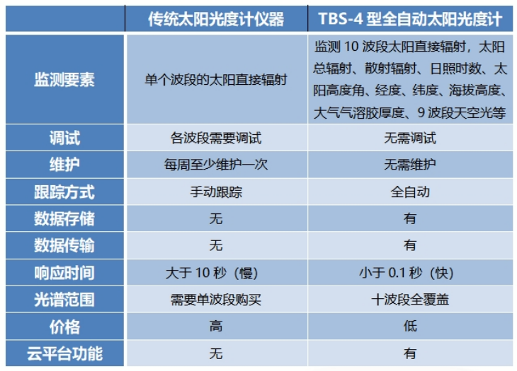 1、采用了同步测量技术,除了可以同时监测10个波段的直接辐射外,还可以监测同一时刻太阳的总辐射、散射辐射、日照时数、太阳高度角、9个波段天空光等要素。它解决了国外同类仪器分时测量存在时间误差的问题,这种测量模式会大大提高太阳的光谱分析精度;