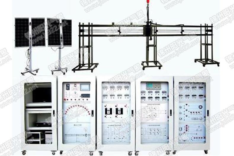 YG-JXST05型大型模拟太阳升降、太阳跟踪、光伏发电、充电逆变实训装置采用1000W节能灯模拟太阳,实验装置可以模拟太阳的弧线升降全过程,而且模拟太阳的升降时间可以根据实验需要进行更改。两台太阳跟踪系统对模拟太阳的移动进行跟踪,两台太阳跟踪系统上的光伏发电装置分别在模拟太阳下的进行发电,并在充电控制系统的控制下向蓄电池充电,逆变系统对蓄电池的直流电进行逆变,产生220V交流电,并给灯泡交流电机等负载供电。