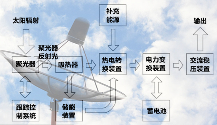 太阳能碟式聚光发电系统,是利用抛物面聚光原理制成的一种利用光热来发电的系统。包括较复杂精密的光跟踪系统、控制系统、机械系统以及实验演示系统等部分。