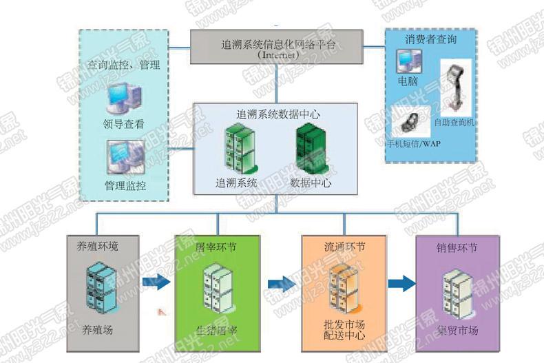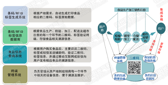 食品追溯平台是一个基于B/S 架构的软件平台,系统将每个环节的食品关联信息自动记录到数据库,用户可以通过互联网访问系统获取相关的食品追溯信息。食品安全溯源系统主要包括三个子系统、一个数据库。
