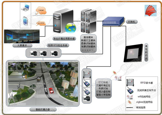 智能交通实训系统采用完整的物联网技术架构,即感知层、传输层和应用层,前端采用智能传感器控制节点采集各种数据并控制各种被控对象,传输层通过WIFI等无线网络接入智能网关,将各种数据传输至云端服务器进行数据处理并反馈给控制器。该系统包含了GPS高速视频定位、GIS导航系统、智能交通应用等平台、软硬件设计资源可开放供教学科研使用。该系统使用的设备包括高清定位摄像头、红外探测器、超声波探测器、霍尔探测器、RFID读写器和智能小车等。