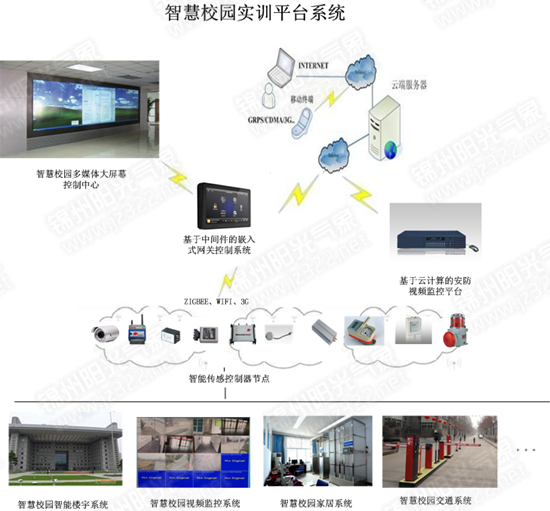 智慧校园实训系统采用完整的物联网技术架构,即感知层、传输层和应用层,前端采用智能传感器控制节点来采集各种数据并控制各种被控对象,传输层通过ZIGBEE、WIFI、3G网络接入智能网关,将各种数据传输至云端服务器进行数据处理并反馈给控制器。该系统包含了智能视频服务中心、Niagara 智能中间件、3D虚拟现实交互以及云计算中心等平台。该系统可扩展性强,软硬件设计资源可开放供教学科研使用。该系统所使用的设备包括各类带通信模块的智能传感器、RFID读写器、高清监控摄像头、GPS、地感线圈、超声波探测仪、红外探测仪、智能电表、智能水表、支持各类通信协议的嵌入式网关和云服务器等。