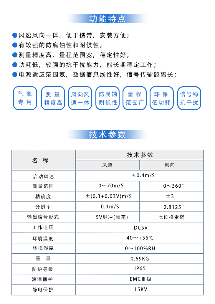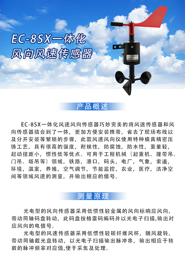 EC-8SX一体化风速风向传感器巧妙完美的将风速传感器和风向传感器结合到了一体,更加方便安装携带,省去了现场布线以及分开安装等繁琐的步骤,此款风速风向仪使用特种模具精密压铸工艺,具有很高的强度,耐候性,防腐蚀,防水性,重量轻,起动扭距小,惯性低等优点??捎糜诠こ袒担ㄆ鹬鼗?、履带吊、门吊、塔吊等)领域,铁路,港口,码头,电厂,气象,索道,环境,温室,养殖,空气调节,节能监控,农业,医疗,洁净空间等领域风速的测量,并输出相应的信号。