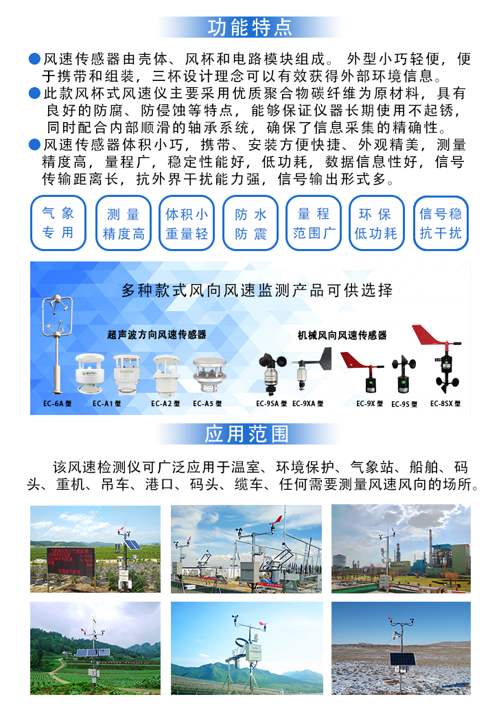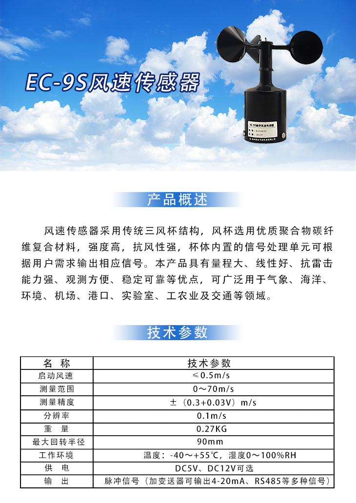 风速传感器采用传统三风杯结构,风杯选用优质聚合物碳纤维复合材料,强度高,抗风性强,杯体内置的信号处理单元可根据用户需求输出相应信号。本产品具有量程大、线性好、抗雷击能力强、观测方便、稳定可靠等优点,可广泛用于气象、海洋、环境、机场、港口、实验室、工农业及交通等领域。