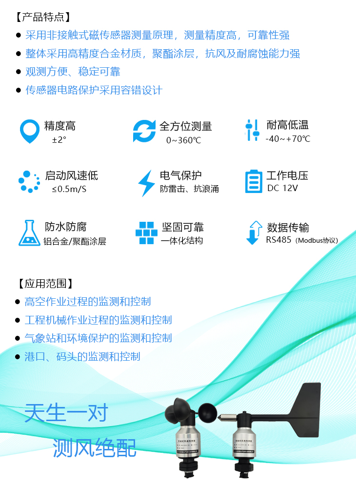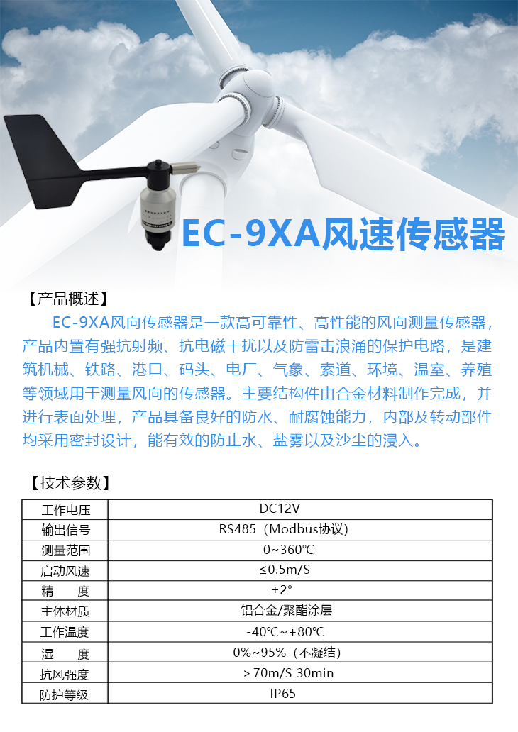 EC-9XA风向传感器是一款高可靠性、高性能的风向测量传感器,产品内置有强抗射频、抗电磁干扰以及防雷击浪涌的保护电路,是建筑机械、铁路、港口、码头、电厂、气象、索道、环境、温室、养殖等领域用于测量风向的传感器。主要结构件由合金材料制作完成,并进行表面处理,产品具备良好的防水、耐腐蚀能力,内部及转动部件均采用密封设计,能有效的防止水、盐雾以及沙尘的浸入。