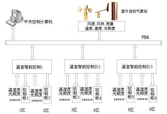 温室计算机控制系统包括中央控制计算机,中文温室智能控制软件,HK温室环境中文液晶智能控制仪,温度、湿度、照度传感器和室外气象站,温室强电柜等组成。中央控制计算机,中文温室智能控制软件可以对温室控制系统进行配置,设定控制仪数量,监测各温室内温度、湿度、照度和室外气象站环境数据,监视各温室设备的运行,读取或设定各控制仪的控制参数;HK温室环境中文液晶智能控制仪采集温室内温度、湿度、照度等环境数据,根据设定的控制参数和控制程序,控制温室设备的运行,自动调节温室环境因子。