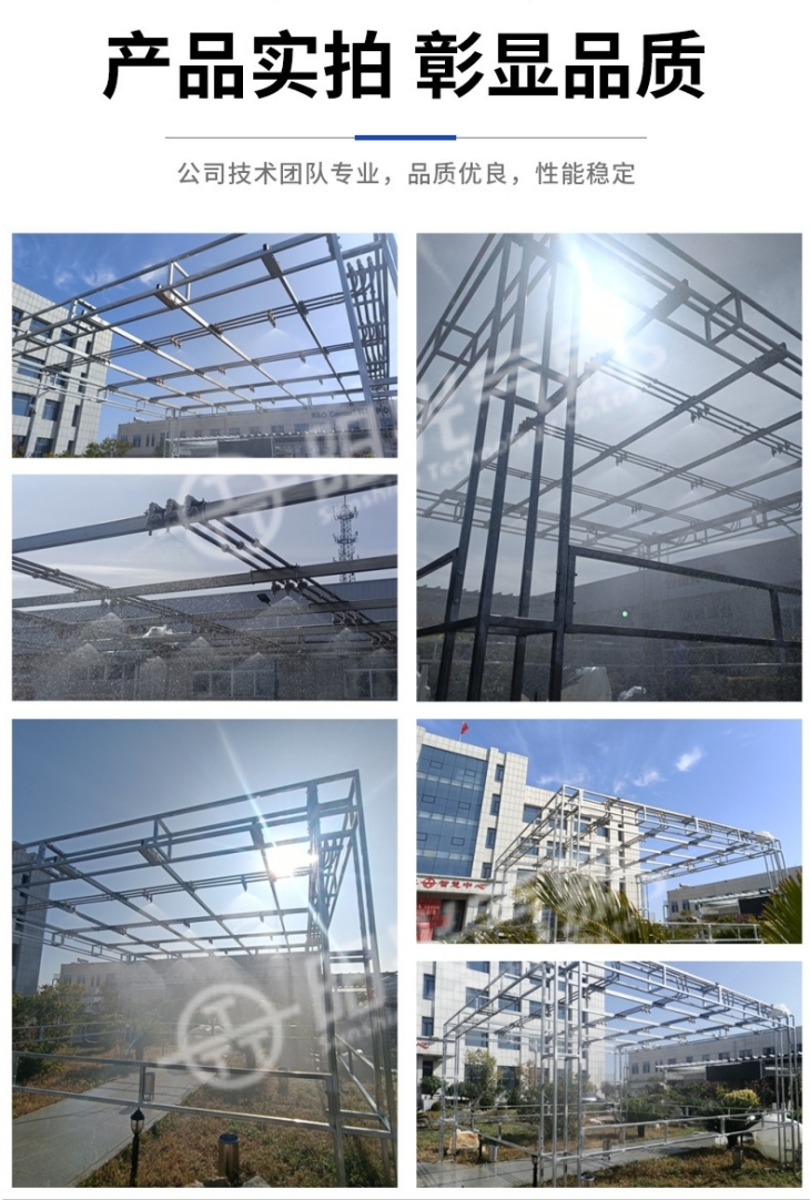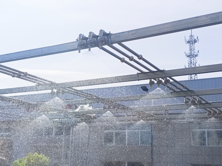 喷雾单元由供水管路、直管段、喷嘴、支架等组成,喷嘴采用专业模拟雨滴喷头——旋转下喷式喷嘴,不锈钢材质,喷嘴和直管段集成在一起,喷雾支架为不锈钢方管结构,用来架设供水管路和喷嘴。喷雾单元设计喷雾量为200~1000L/H,喷雾压力0.5~3Bar,喷雾高度和覆盖面积可按用户需求进行定制。