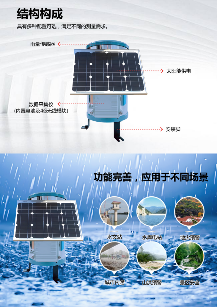 2. 可同时监测瞬时雨量、雨强、日累计雨量等气象参数;